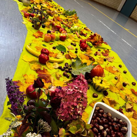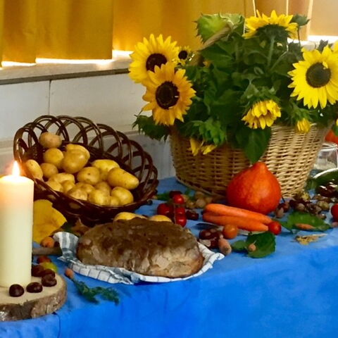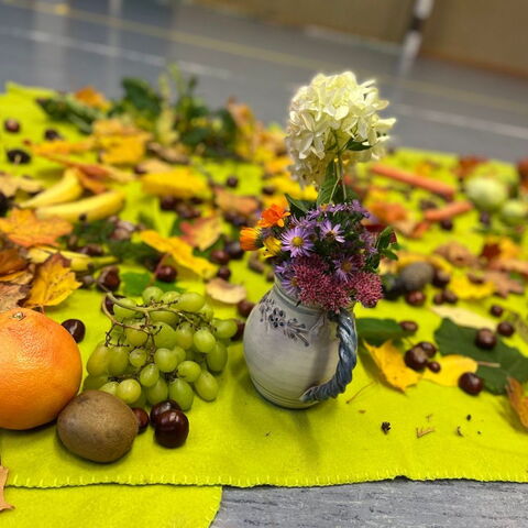 Am 6. Oktober feierten die Kolibris gemeinsam mit Pfarrer Leinweber das Erntedankfest. Jedes Kind brachte Obst, Gemüse, Baumfrüchte oder herbstlich gefärbte Blätter mit. So entstand ein bunter Teppich aus Erntegaben, der sehr gut zum gemeinsam vorgetragenen Herbstlied passte.