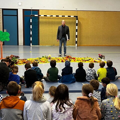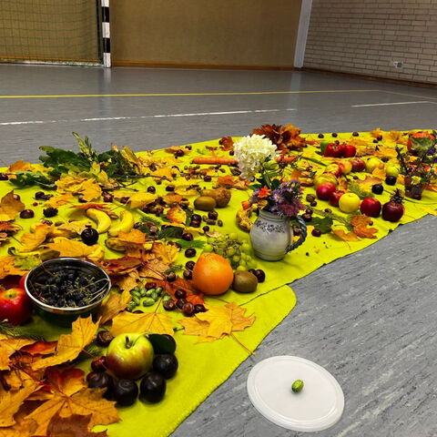 Am 6. Oktober feierten die Kolibris gemeinsam mit Pfarrer Leinweber das Erntedankfest. Jedes Kind brachte Obst, Gemüse, Baumfrüchte oder herbstlich gefärbte Blätter mit. So entstand ein bunter Teppich aus Erntegaben, der sehr gut zum gemeinsam vorgetragenen Herbstlied passte.